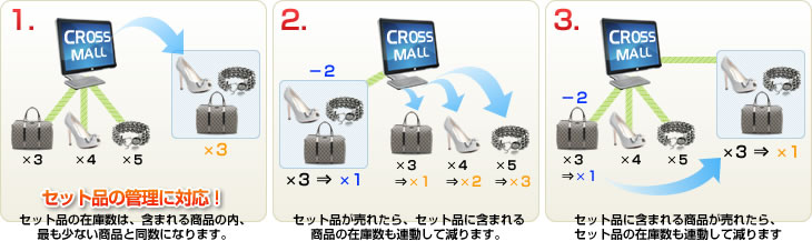 「CROSS MALL」に登録することで、「セット商品が売れた際に、構成する商品の在庫数を在庫更新」・「構成する商品が売れた際に、セット商品の在庫数を在庫更新」することができます。
